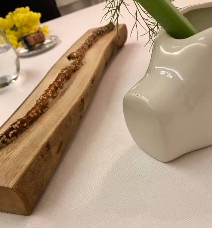 Il brodo di funghi, molto intenso, spezza la sequenza e introduce uno dei piatti memorabili della serata, l’idea del carciofo presentato per quello che è che pochi ricordano: un fiore! Mangiato con le mani, buonissimo e straordinario.