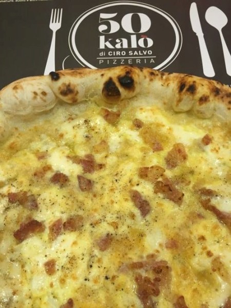 A 50 Kalò la pizza Carbonara è la grande novità della stagione, frutto di una ricerca a cui Ciro Salvo si dedica da tempo: con le uova biologiche di San Bartolomeo, il fior di latte di Agerola, il guanciale irpino e il parmigiano reggiano DOP 36 mesi, pepe nero e olio extra vergine di oliva Dop delle colline salernitane, è una pizza sontuosa e di grande sapore. Altra novità è la pizza con ricotta e mortadella di Bonfanti, presidio Slow Food, prodotta utilizzando solo spalla e guanciale di suini italiani pesanti, senza aggiunta di additivi chimici.