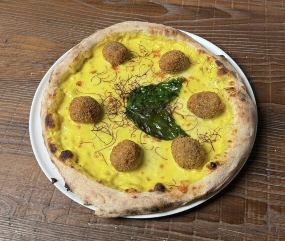 Per il topping, preparare una crema di riso allo zafferano con polpette fritte di bollito (mondeghili), fior di latte e fili di peperoncino. Distribuire sulla base la crema di zucca e il fior di latte; in uscita dal forno, unire il guanciale al pepe stagionato 16 mesi, provola affumicata, filetti di mandorle e salsa al basilico.