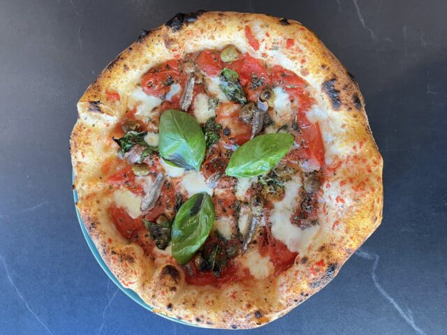 pomodoro a pacchetelle, fior di latte, alici di Menaica, aglio, olive, capperi, basilico, origano e olio Evo