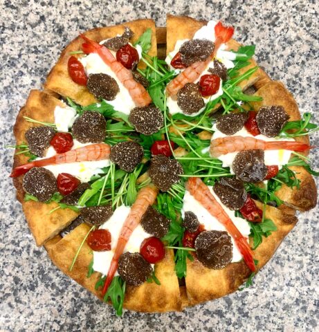 Praticate 5 – 6 fori sul panetto già steso e immergerlo in olio bollente a 180° fino a doratura, dopodiché riporre su carta assorbente da cucina. Ripassare in forno preriscaldato per circa 3 – 4 minuti. Completata la seconda cottura la base della pizza in doppia cottura é pronta per essere farcita. Condire con rucola fresca, burrata, gambero rosso, pomodorino semi secco e tartufo fresco.
