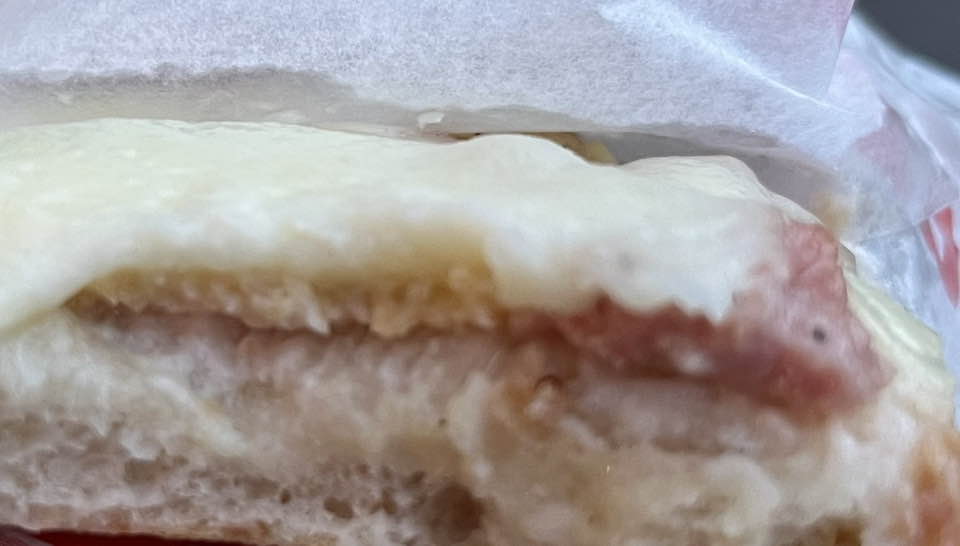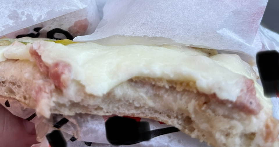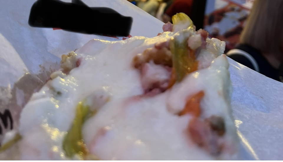 Trancio di dimensioni normali, ricoperto da una coltre formaggiosa che tutto sembrava, alla vista e al gusto tranne mozzarella, leggermente acida ma col caldo può capitare (non dovrebbe), sapore di salsiccia e fiori di zucca non pervenuto, ma soprattutto, impasto crudo sotto la coltre bianca che credo, essendo troppo spessa, non ha permesso alla parte sottostante di cuocere bene. Nessuna croccantezza al morso, che dovrebbe essere un must nella pizza in teglia, impasto molliccio. Prezzo troppo caro: 3 euro.
