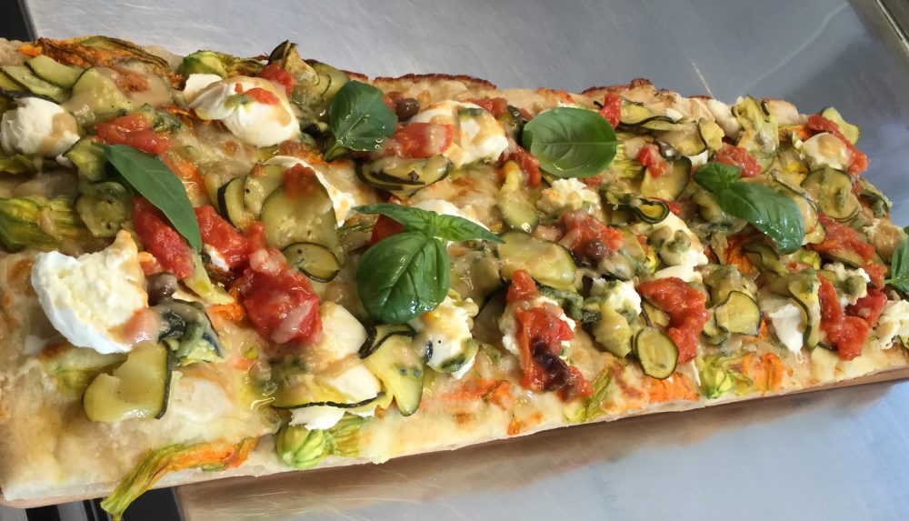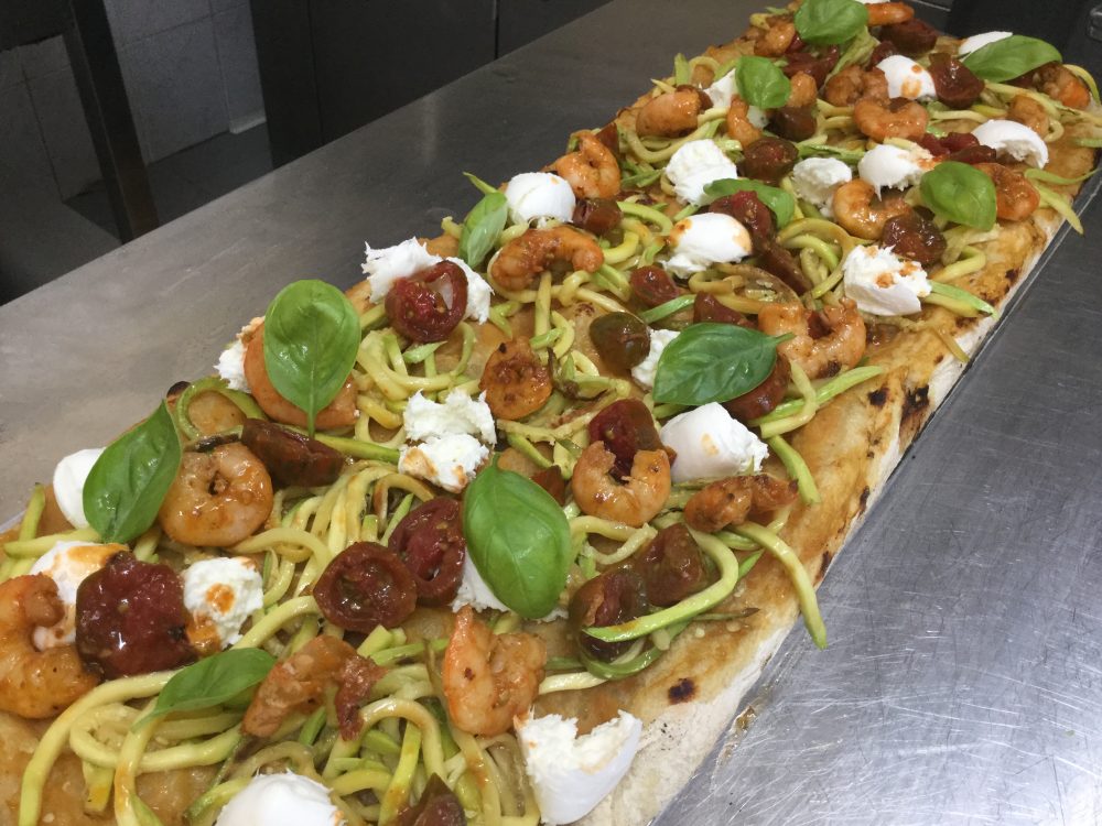 E tra le sue pizze troviamo quella con la cipolla rossa di Tropea stufata con aceto di mele e polpo arrostito al rosmarino o con una tagliata di tonno aromatizzata alle erbette o quella con una pizzaiola di gamberi, del pomodorino essiccato accompagnato da una crema di mozzarella di bufala e battuto di olive taggiasche; la pizza con i fiori di zucca, mozzarella di bufala e guanciale o quella con baccalà e olive; e ancora ai frutti di mare o con rapette fresche, patate ripassare in padella, salsiccia e crema di stracciatella.