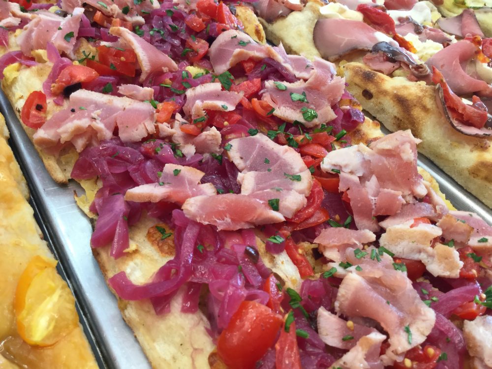 Il suo banco è uno spettacolo già solo a vedersi: 3 metri di esposizione che sono un luna park del gusto che, una volta allestito, rimpiazza con qualche teglia, prendendo solo un numero limitato di prenotazioni per poter garantire l’alta qualità delle sue creazioni.