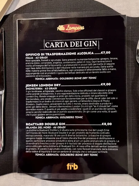 In abbinamento a questi fuori menù viene proposta anche una carta dei Gin, che si è rivelata una proposta originale e ben azzeccata.