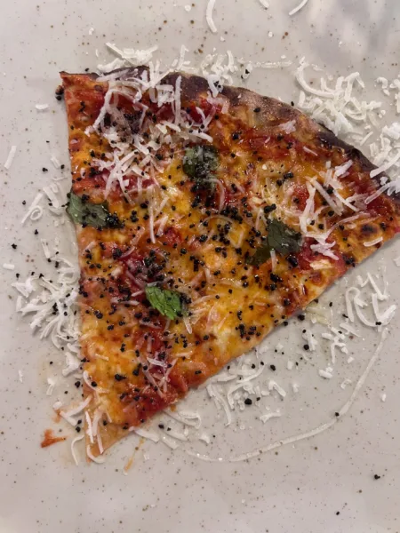 La “Nduja & Miele” prevede un impasto e una stesura diversi dalle altre: si presenta come una pizza “alla romana”, croccante, ma ancora vellutata e con cornicione appena percepibile. Troviamo pomodoro arrosto in crema, fiordilatte, nduja, pecorino, miele friulano, polvere di olive, foglioline di menta. Si è rivelata la nostra preferita!