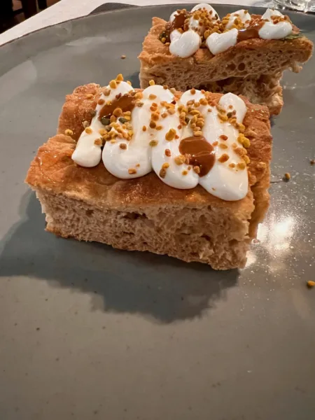 Raffaele non ci lascia andare via senza una chicca dolce e ci stupisce ancora una volta con un impasto alla pala orzo e riso, ricotta morbida, polline, foglioline di menta, gocce di crema di nocciola.