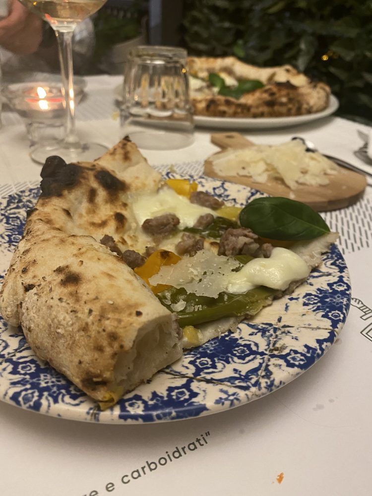 Personalmente ho optato per la Cosacca, per la quale Giuseppe utilizza il conciato romano (tra l’altro ben dosato) in sostituzione del pecorino e/o parmigiano reggiano, e per la pizza Domenica, che tra gli ingredienti annovera i peperoncini verdi di fiume e le pacchetelle gialle del Vesuvio. Una pizza dal sapore di estate e dal profumo inconfondibile, dove in aggiunta al condimento è servito a parte il pecorino romano da utilizzare a piacimento.