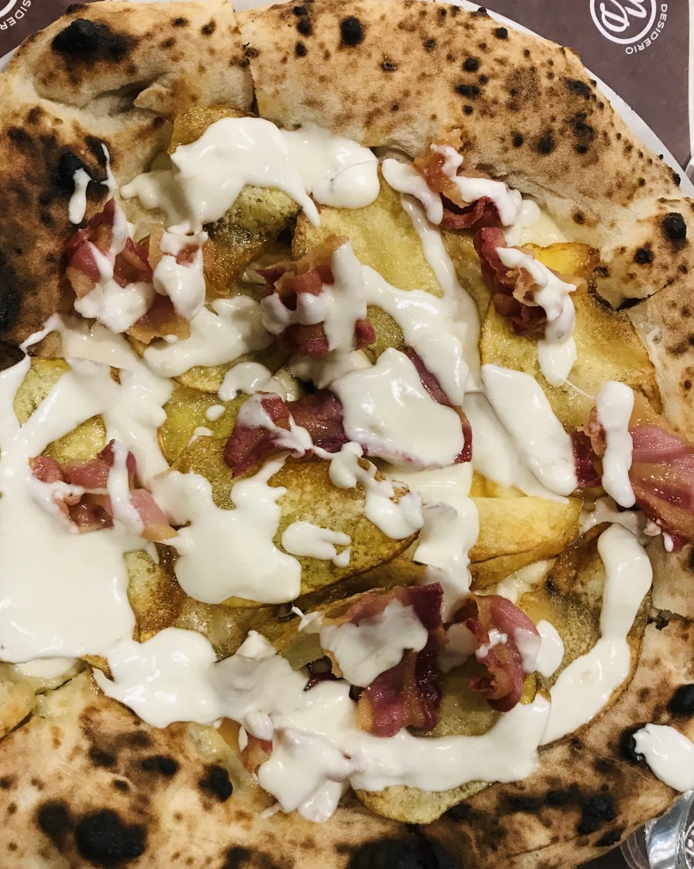 Ci sono poi pizze mensili, e quelle pensate e realizzate in collaborazione con altri locali, come la London 1.9 ideata con la pizzeria Fiore Bianco di Napoli. E’ condita con bacon croccante, fior di latte di Agerola e – in uscita dal forno – chips di patate, fonduta di parmigiano e un filo di ottimo olio extravergine.