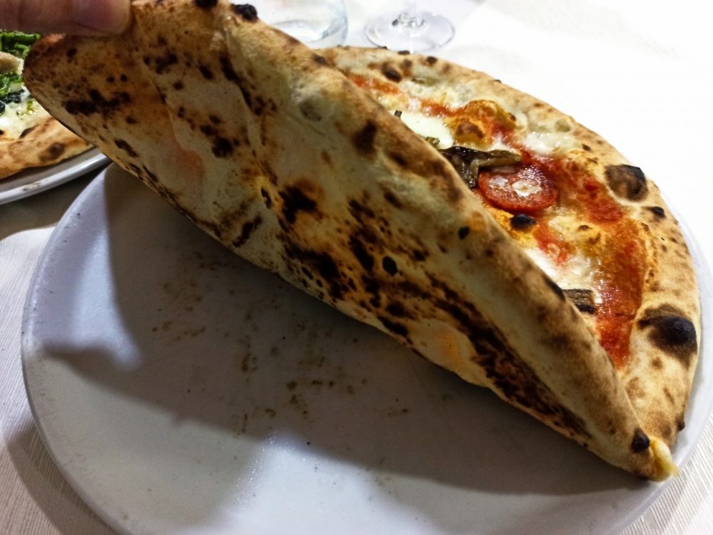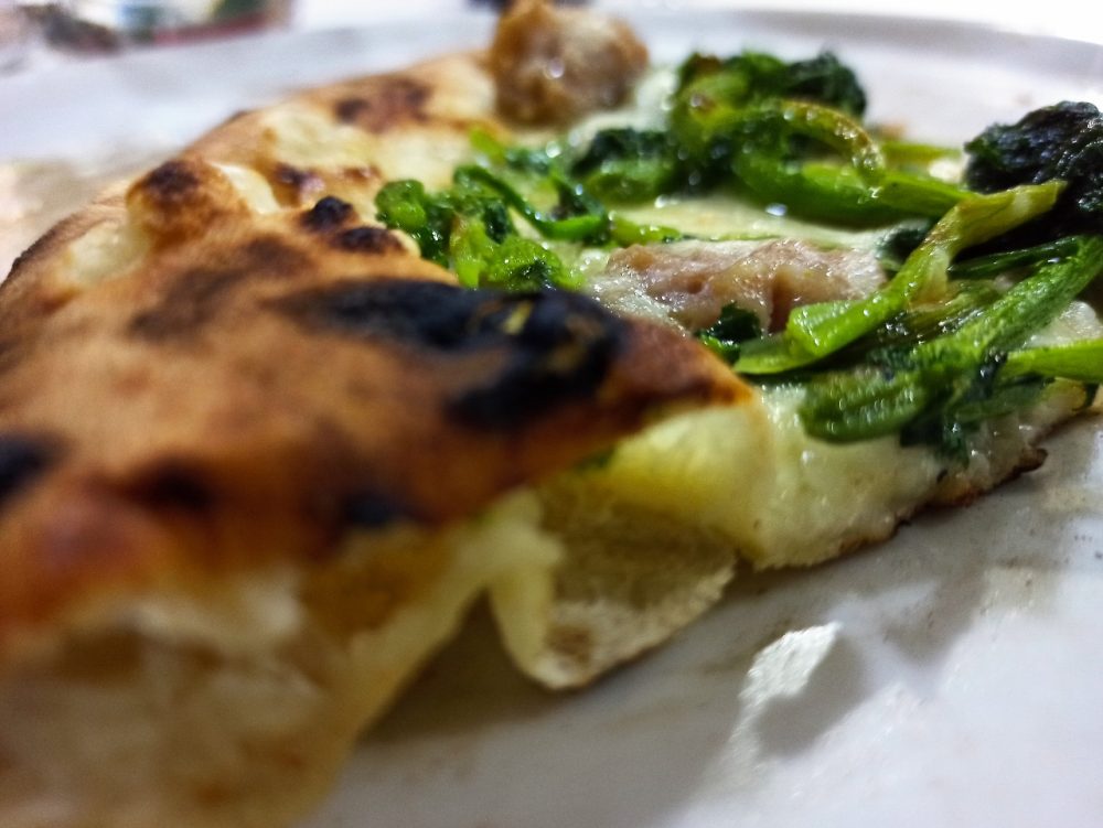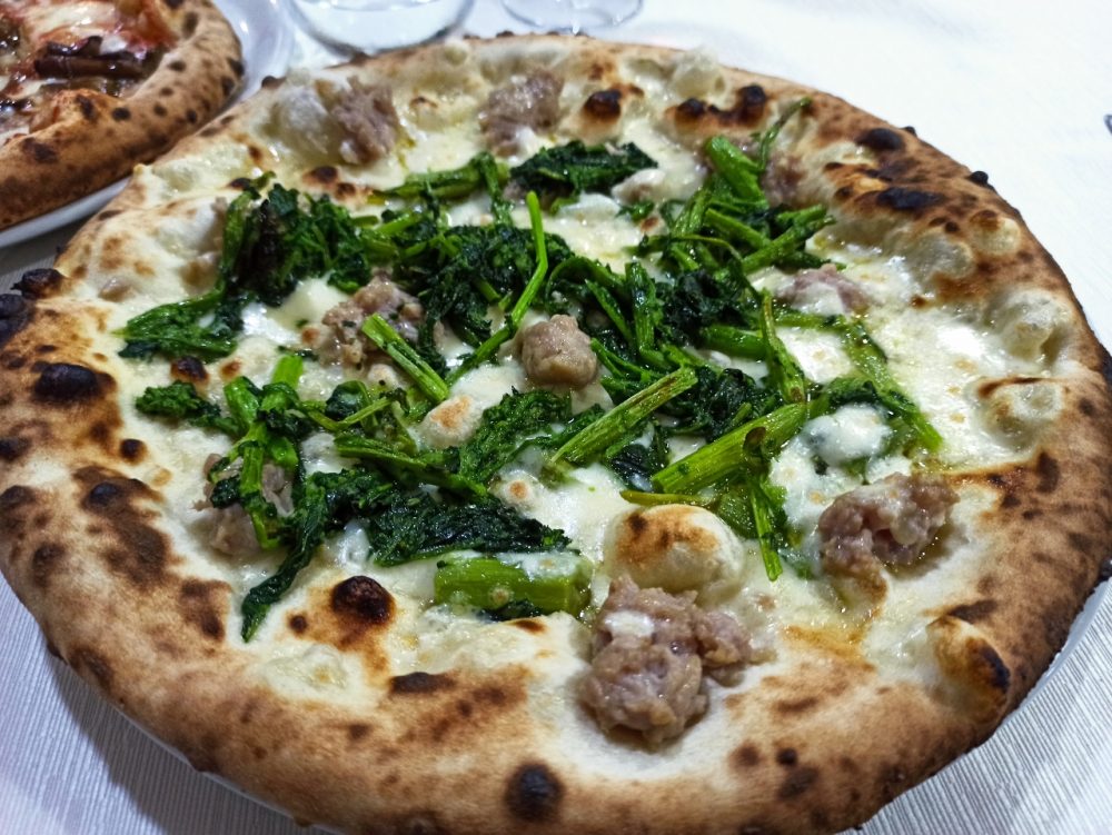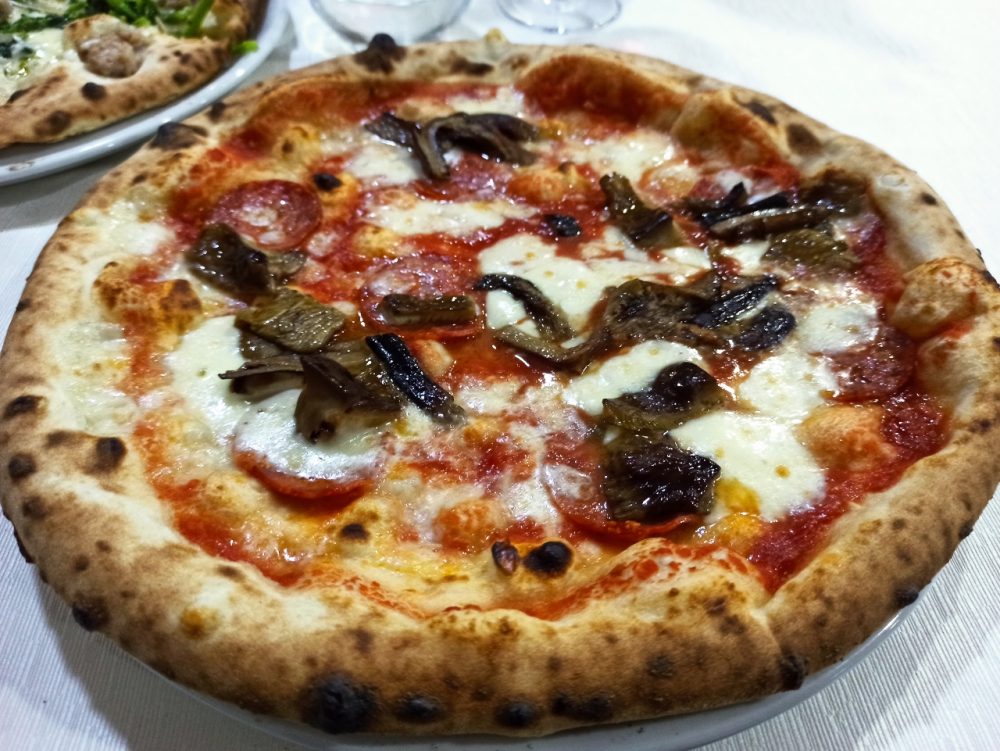 La Pizza in “stile napoletano” viene esaltata in molte opzioni dai prodotti del territorio, così ne ordiniamo una con Broccoli e Salsiccia paesana, e una con Chiodini freschi e Salame piccante.