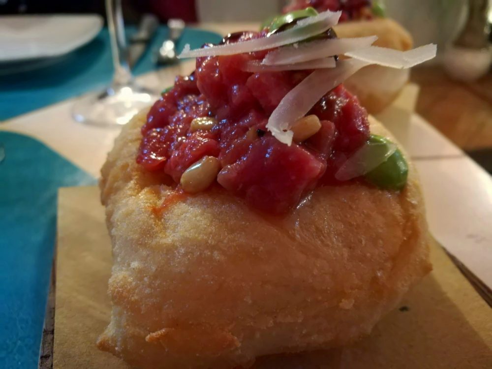 Uno dei cavalli di battaglia dello chef è la Braciola “cruda”, una riproposizione di quella tradizionale fatta però con una Tartare di Marchigiana del Sannio, Uvetta, Pinoli, spuma di Prezzemolo e Aglio, riduzione di Aglianico e scaglie di Caciocavallo Irpino. La si può assaggiare o su una Pizza dedicata o, come abbiamo fatto noi, su una Montanara fritta.