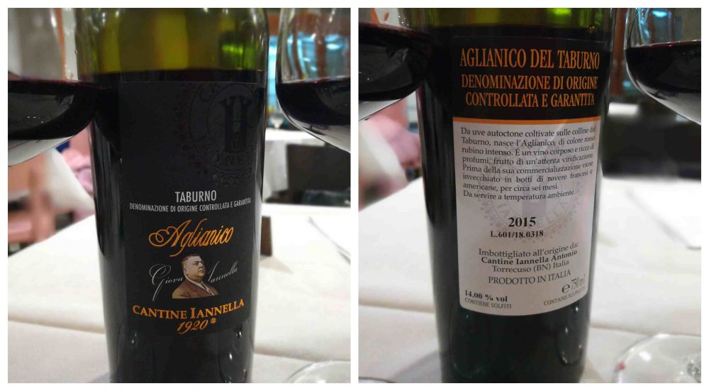 Dalla “Carta dei Vini e delle Birre” scegliamo un bel Aglianico del Taburno Docg 2015 delle Cantine Iannella Antonio 1920 di Torrecuso. Questo vino ce l’hanno anche nel frigo in sala e fortunatamente era proprio lì davanti a noi e abbiamo potuto fermare il ragazzo prima dell’apertura e farci portare una bottiglia a temperatura ambiente, potendo così godere dei profumi e dei sapori sin dal primo sorso.