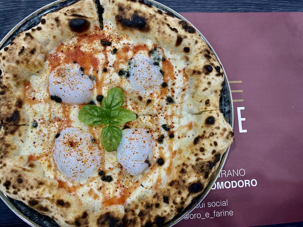 Una grande sala con una novantina di coperti e spazio esterno che ne contiene una trentina, il locale moderno nell’arredo è di proprietà di Paolo Pecorario titolare anche del ristorante Oro & Frattaglie distante 50 metri dalla pizzeria. Ambiente luminoso, accogliente e con una grande vetrata sul forno dove il pizzaiolo Antonio Ferraiuolo – che conosciamo da diversi anni – si diverte a preparare impasti ottenuti con fermentazioni spontanee, senza l’impiego di agente chimico, ma con l’utilizzo di acqua fermentata di mirtilli o in alternativa di mela verde, con la quale realizza la miscela per la biga, il preimpasto di fermento solido, ottenendo poi la base della pizza napoletana, mentre per la pizza in pala impiega il metodo poolish.