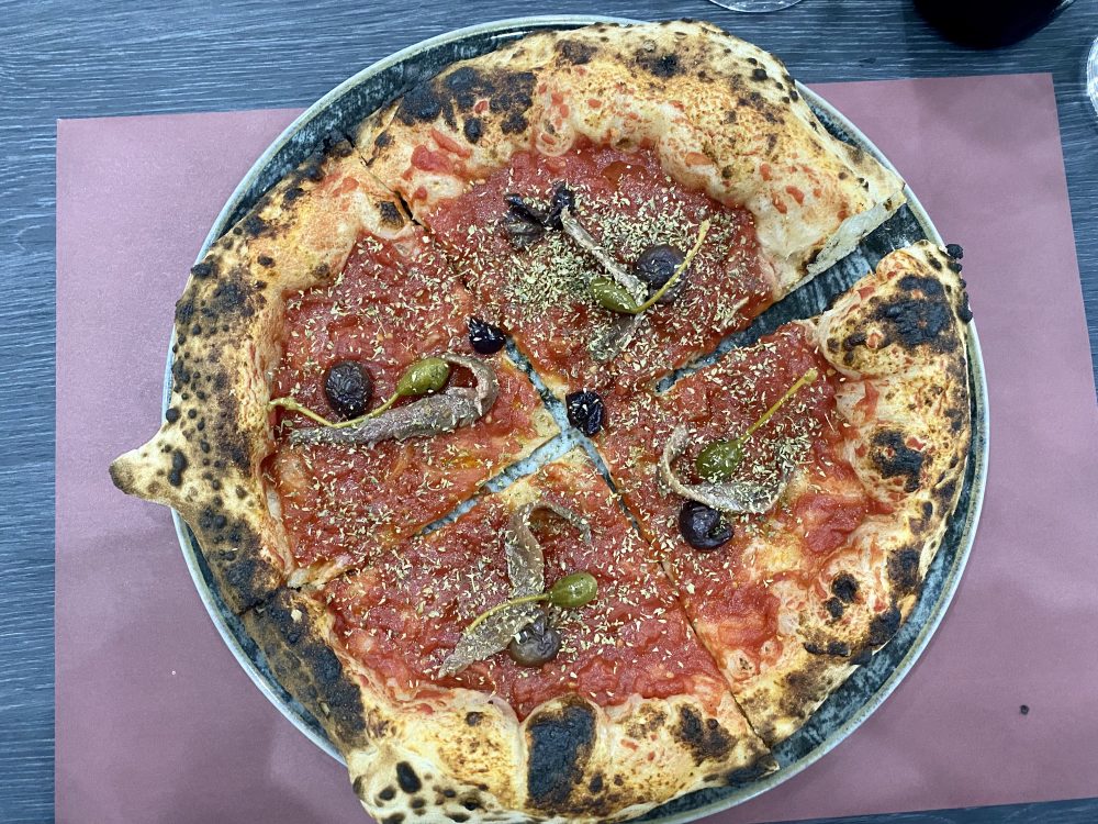 E veniamo al menù, ben organizzato, con la declinazione di 15 pizze, che si dividono tra le classiche e quelle di fantasia, che ricadono sotto la dicitura “i nostri viaggi”. Poi i ripieni e la pizza in pala proposta in due gusti: mortadella, pistacchio e provola, quella scelta da me, gustosa e con l’effetto crunch assicurato, e la pulled and pork. La pizza Marinara Nostra è condita con pomodoro san Marzano, aglio rosso di Nubia, capperi di salina, alici di Cetara, olive caiazzane e origano di montagna.