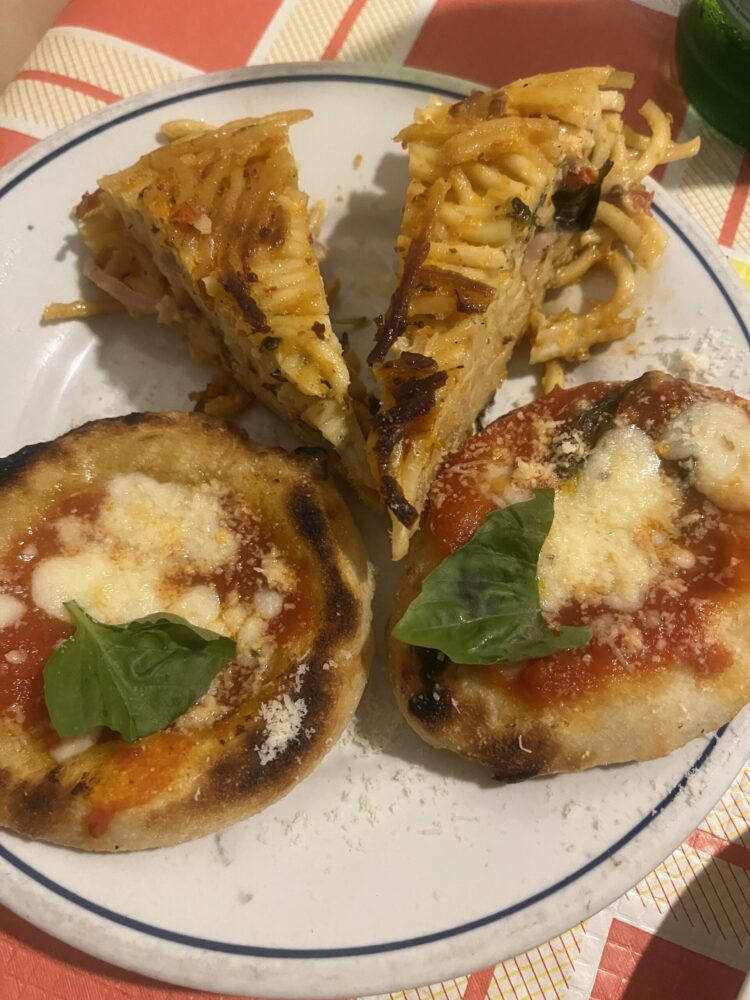 E suggeriamo anche la pasta con ragù, sempre cotta nel forno, con al centro una bella polpetta al sugo. Anche con le pizze, si resta sulla tradizione, con disco di pasta steso sottile, non a ruota di carro, ma di media grandezza.