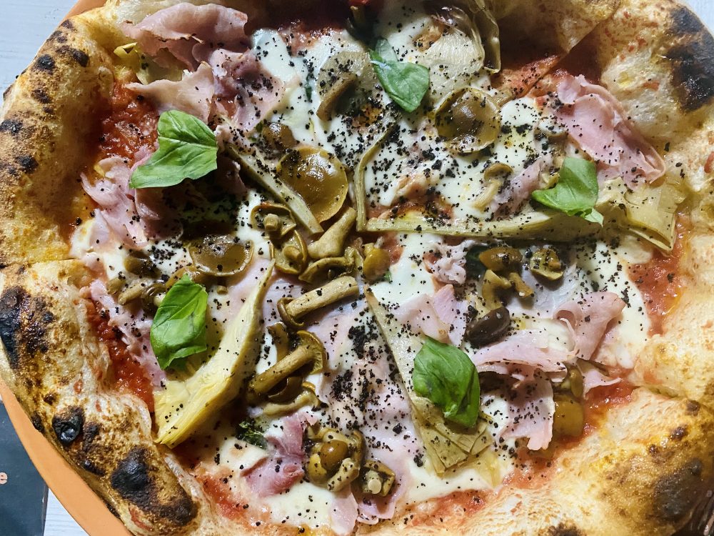 L’approdo al molo, condita con pomodoro San Marzano, aglio orsino, origano e olio extravergine; la Bufala Vesuviana, che oltre alla mozzarella di bufala campana (caseificio Antico Demanio), ha i pomodorini gialli a pacchetella e quelli rossi del Vesuvio in semi dried; Capricci e Fantasia, che si rifà alla classica capricciosa; Interni d’artista, con la salsiccia di suino (carni Ducale), scaglie di tartufo nero estivo casertano, pesto di tartufo nero, ricotta salata (Terre Magiche Gourmet) ed infine la pizza padellino: Benvenuto al Sud, che conta tra gli ingredienti la presenza del prosciutto crudo di Parma stagionato 16 mesi. L’impasto, alto e fragrante, rimane lievemente crunch sui bordi.