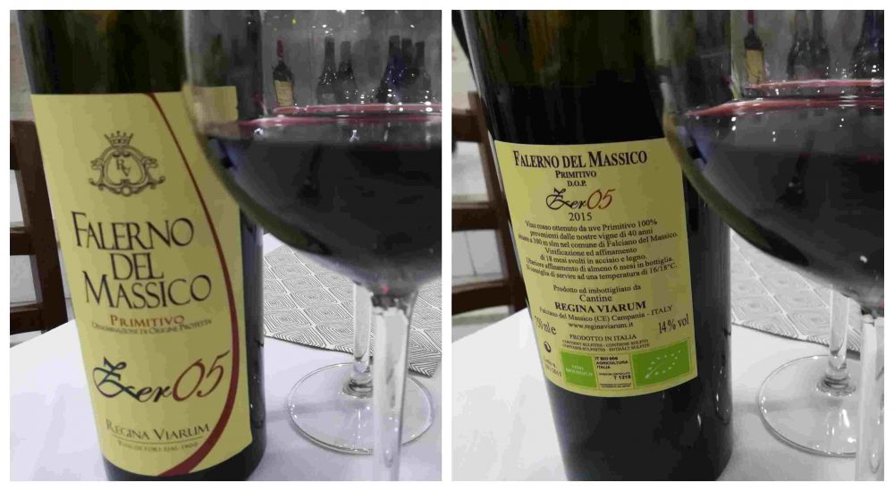 C’è la carta delle birre artigianali; -c’è quello, se non ricordo male, delle brioche siciliane con gelato; -e infine la carta dei vini dalla quale scegliamo il Falerno del Massico Zer05 prodotto e imbottigliato dalla Cantina Regina Viarum di Falciano del Massico, ottenuto da uve Primitivo 100%, provenienti da vigne di 40 anni, e affinato per complessivi 24 mesi tra acciaio, legno e bottiglia.