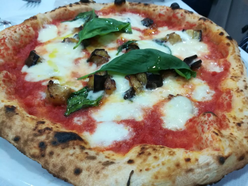Noi, come al solito, ordiniamo qualche specialità o qualche personale accostamento che ci viene in mente leggendo gli ingredienti delle varie pizze. Così decidiamo per la fuori-menù che, come detto, ci aveva già incuriosito prima di arrivare al locale, fatta con le Papaccelle Napoletane Presidio Slow Food (dell’Azienda Agricola Vincenzo Egizio di Brusciano), le Patate al forno e la Salsiccia secca di Maialino Nero Casertano (salsiccia che viene posta al di sotto del latticino e che emerge durante il taglio). E per una Ortolana con l’aggiunta di scaglie di Provolone del Monaco Dop.