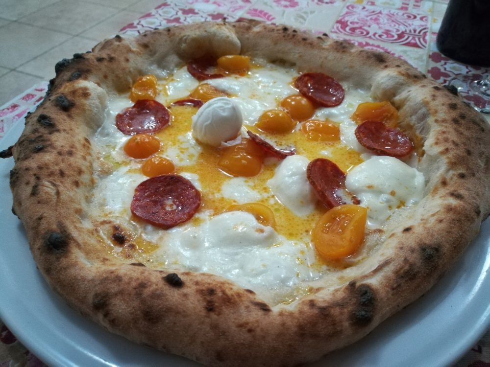 La seconda pizza è condita con pomodorini gialli, salame piccante e l’eccellente Mozzarella di Bufala proveniente dal Caseificio San Carmine dal 1987 di Maddaloni distante meno di 3 km dal locale, che rende unica e imperdibile questa pizza.