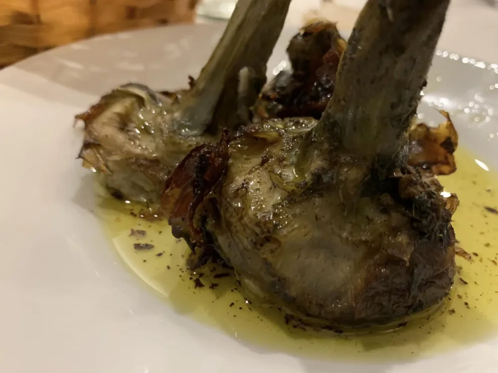 Menzione speciale per i contorni con i quali abbiamo deciso di aprire la cena: puntarelle croccanti ed equilibrate; cicoria ripassata da 10 e lode e carciofi alla romana con una punta di croccantino sulle foglie sterne, davvero niente male. E poi l’extravergine più che dignitoso, per essere in una trattoria.