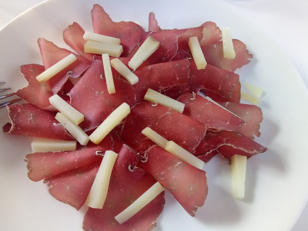 Per antipasto iniziamo con un copioso piatto di bresaola artigianale della Valtellina, che per timidezza si fa accompagnare da piccole listarelle di formaggio latteria di Grigio Alpina della Valsassina. Non posso deludere le aspettative e pertanto confermo l’acclarata bontà.