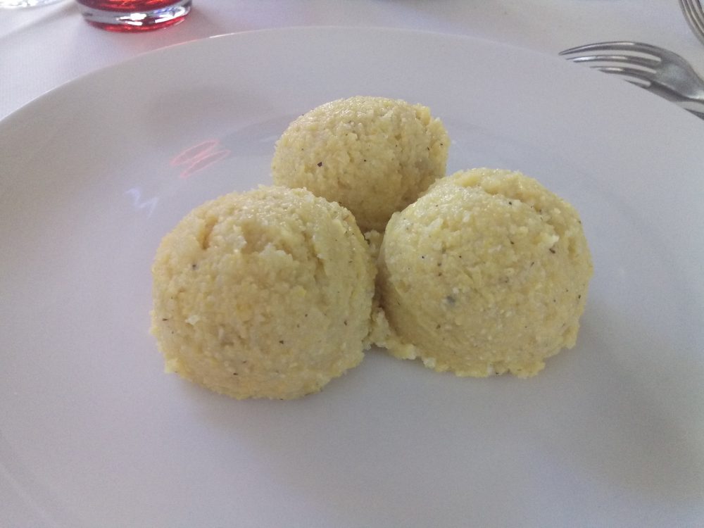Per secondo mondeghili (una sorta di polpette molto saporite fritte nel burro e confezionate con carne di manzo, salsiccia, salame crudo, pane bagnato nel latte, uovo, formaggio grana, aglio, cipolla e noce moscata), serviti insieme con purè di patate di Oreno. A parte, poi, ho voluto provare anche delle palline di polenta. Che dire, le buone sorprese non finiscono mai.