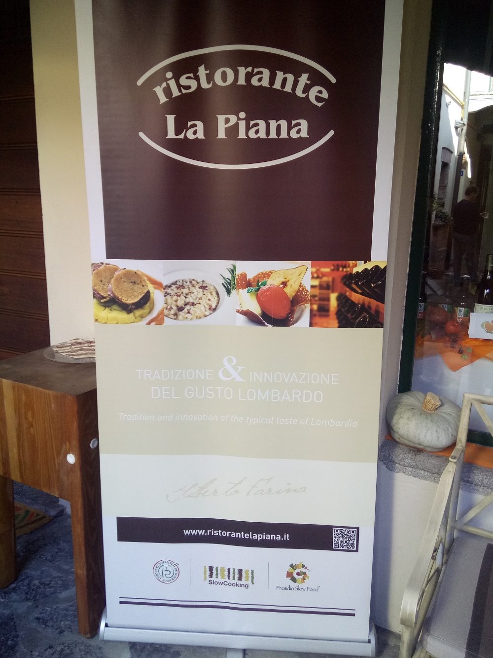 Sole tiepido, ma che riesce comunque a scaldare l’anima. La mia guida corre veloce sulle verdi e comode strade brianzole, dopo avere scansato magistralmente con la sua Panda gialla il traffico milanese che dal centro porta fino a Viale Zara, cioè verso l’hinterland orientale. E’ la seconda volta in poche settimane che attraverso questo territorio e mi pare già molto familiare. La Villa Reale di Monza, quella di San Martino di Arcore e quella di Gallarati Scotti di Vimercate e poi Lesmo con la sua famosa curva dell’autodromo monzese, il convento di San Francesco di Oreno (un paesino famoso per la produzione di ottime patate come mi conferma Marco e come vedremo poi) e tutte le piccole e linde cittadine che oltrepassiamo senza soluzione di continuità. Il mio generoso amico ed anfitrione Marco Galetti, insieme con la sua gentile signora, mi vuole condurre presso un posticino davvero speciale. Ecco siamo arrivati finalmente: Ristorante La Piana di Carate Brianza. Due sale, una interna e l’altra all’esterno, quest’ultima è connotata da un’ampia vetrata che si apre direttamente sulla corte. Ambiente quasi rustico ed informale, punteggiato da un arredamento spartano ma funzionale. Tovagliato abbacinante bianco neve. Tavoli ben posizionati.