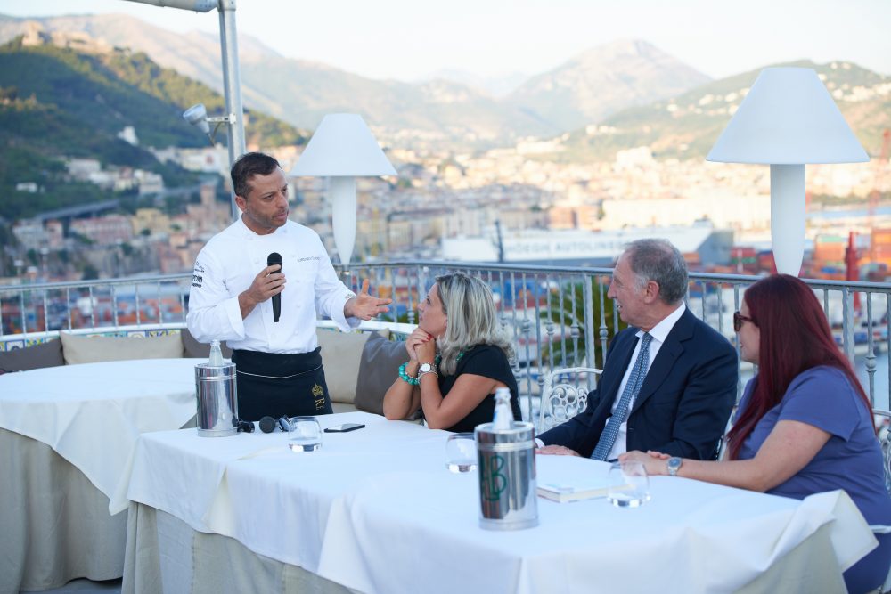 Ci troviamo sulla panoramica terrazza dell’Hotel Lloyd’s Baia di Vietri sul Mare per la presentazione del libro Acqua da Mangiare, Salani Editore, del Prof. Nicola Sorrentino, specialista in Scienza dell’Alimentazione. Dietetica ed Idrologia.