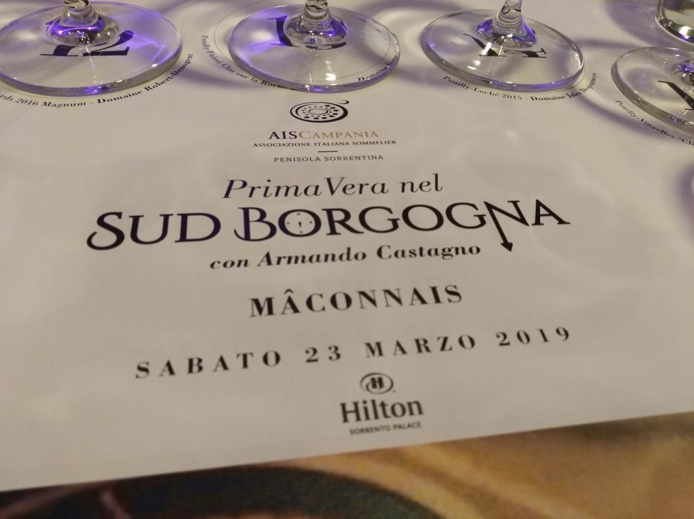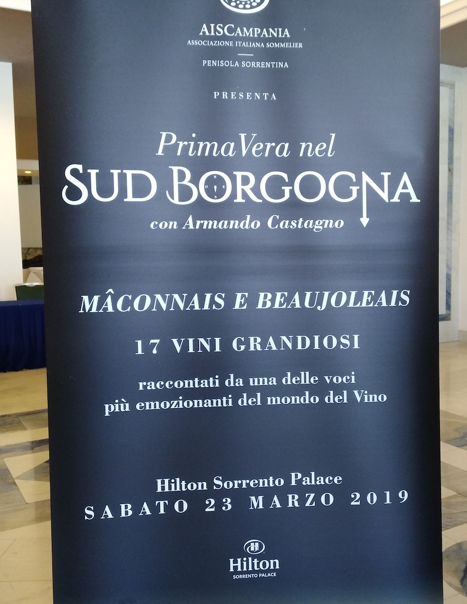 Però mi viene il dubbio che, nonostante il primo attore sia di grande ed innegabile spessore, non bisogna dimenticare che accanto a lui hanno operato almeno altre tre componenti ugualmente importanti che reclamano il primo piano. HIl primo attore è indubbiamente Armando Castagno, che si è avvalso della collaborazione dei vini della Borgogna del Sud e poi dell’Associazione Italiana Sommelier della Penisola Sorrentina, guidata dal bravo e preparato Emanuele Izzo, a cui si deve la perfetta organizzazione di questo evento e subito dopo bisogna ricordare la prestigiosa location che ha fatto da sfondo a questa performance, cioè l’Hotel Hilton Palace di Sorrento.