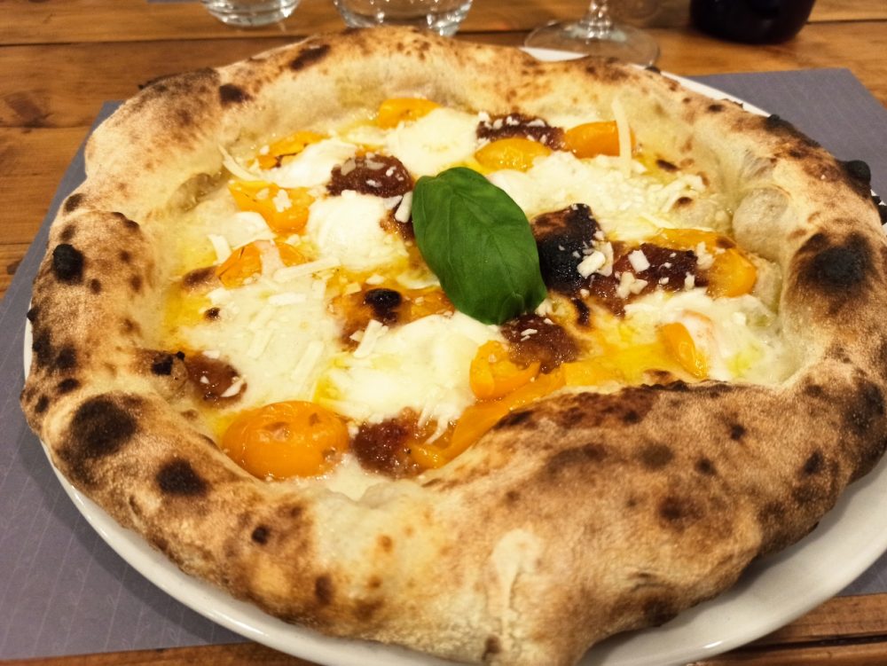 Dopo aver ordinato il vino dalla fornita Carta (un Aglianico del Taburno Docg Pentime 2018 dell‘Azienda Agricola I Colli del Sannio di Torrecuso[14 euro]) cominciamo a leggere il Menù e cattura la nostra attenzione la Giallo Pomodoro [9 euro], una rivisitazione in chiave Sannita di una delle nostre pizze preferite, con appunto Pomodorini Gialli, Mozzarella di Bufala, scaglie di Pecorino e il Salame Spalmabile Selezione Muccio (una sorta di ‘nduja Sannita fatta da uno dei produttori della Salsiccia Rossa di Castelpoto).