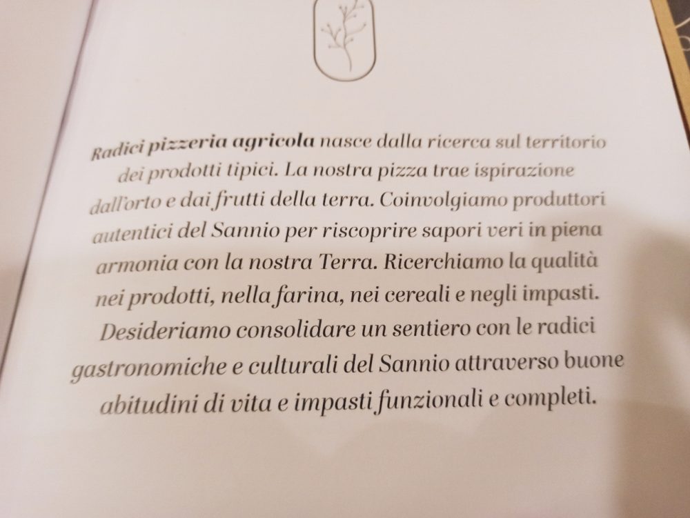 Un esempio concreto di pizzeria agricola, la prima ad aprire in Campania nel 2021, è “Radici” a Pietrelcina, nel comune in provincia di Benevento, luogo di pellegrinaggio dove nacque nel 1887 Francesco Forgione, in seguito conosciuto come Padre Pio. Un borgo antico e terra ricca di biodiversità, che ha dato vita anche alla Comunità Agricola del Carciofo di Pietrelcina, presidio Slow Food, oltre che ad altre eccellenze come formaggi e salumi.