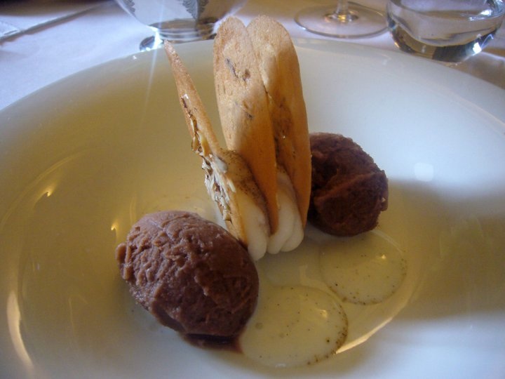 croccante di nocciole dell’Etna con gelo di mandorla pizzuta d’Avola, sorbetto di cacao panela e salsa alla vaniglia di Tahiti e polvere Kawa