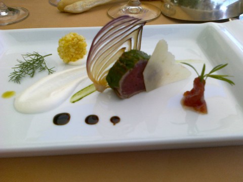 Tradizione: Parmigiana in scatola di spaghetti, piccoli canneloni ripieni di robiola di bufala, filetto di San Pietro scottato con farina di peperone di senise, soufflé di limoni della costiera con sorbetto ai lamponi e birra.