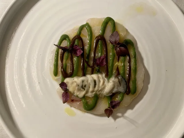 Crudo-di-tracina-ostriche-aglio-nero-e-prezzemolo