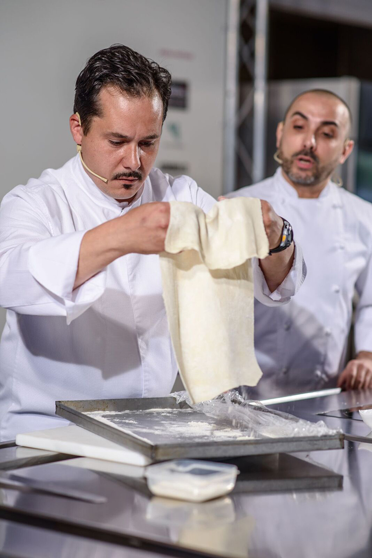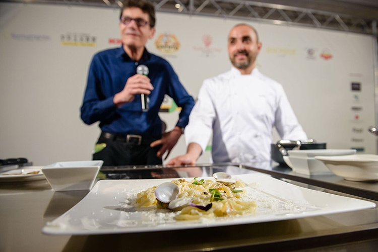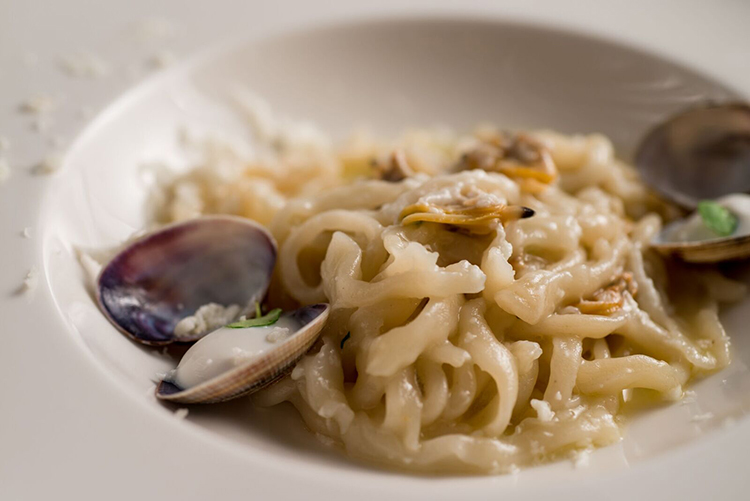 Lui tiene il basso profilo, come sottolinea Luigi Cremona, ma insieme ad Alessandro della Tommasina incanta la sala con una versione inedita e buonissima del classico “spaghetto con le vongole”, profumatissima e decisamente “agliata”. In realtà di tratta di “pici” fatti con la pasta di pane (a dare una leggera acidità) stesa come grosse tagliatelle e poi arrotolata a mano, che viene cotta e mantecata “normalmente” con le vongole sgusciate (cotte sottovuoto concentrandone in sapore).