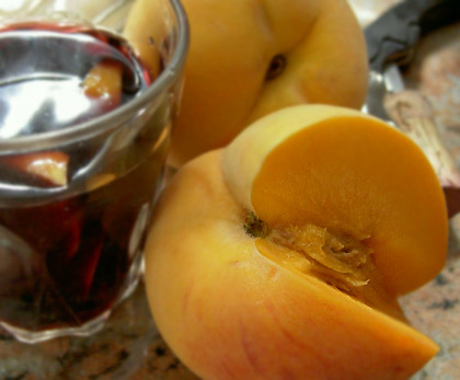 Il segreto di questa ricetta sta nel disporre di percoche mature, ma belle sode e saporite; nel taglio irregolare e nell’inconfondibile “splash” prodotto dalle percoche nel cadere vino bianco a mano a mano che le tagliate.