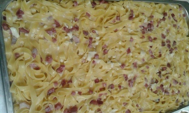 Aggiungete i tagliolini appena lessati (con un po’ della loro acqua se la pasta era di tipo secco), mischiate per bene e mettete tutto quanto così preparato in una teglia unta di strutto o di burro.