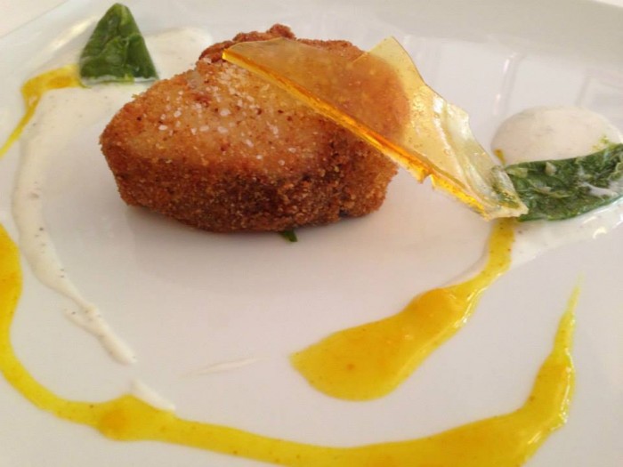 Don Alfonso, merluzzo dorato e friitto, servito con l’osso intero, agrodolce di limoni e yogurt di bufala acidulo. 2014