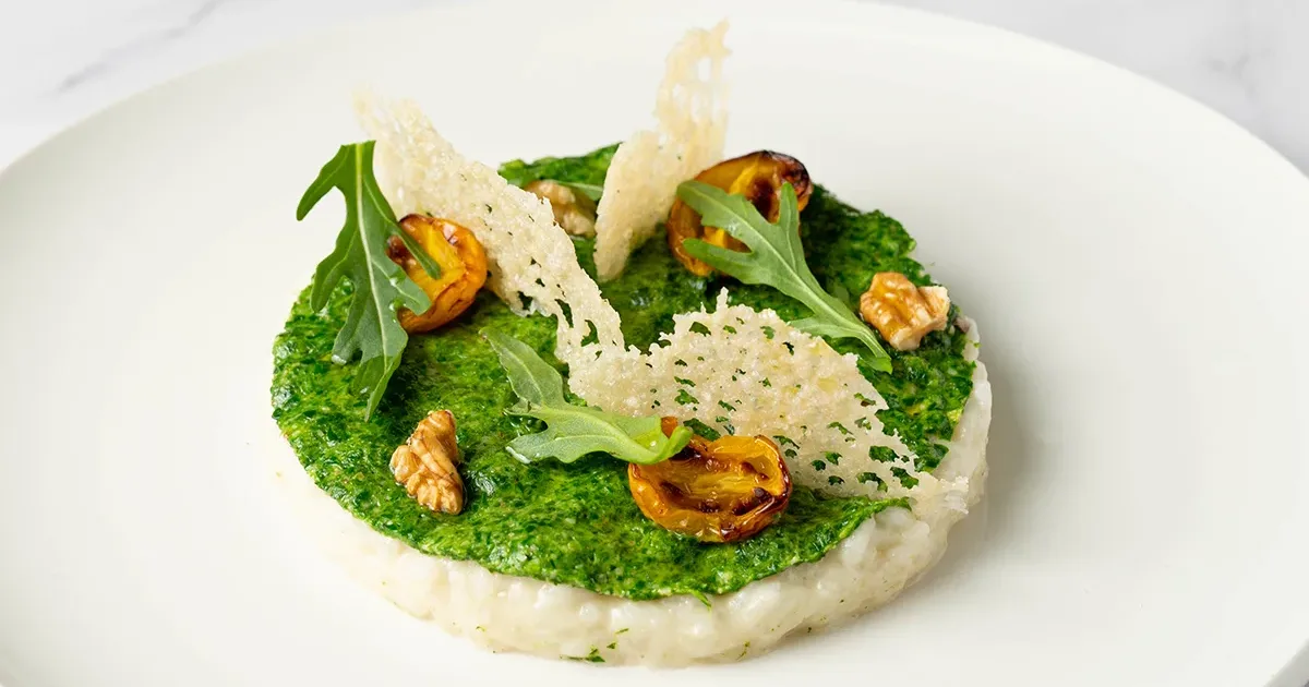 Risotto al Parmigiano Reggiano, pesto di rucola e pomodorini infornati