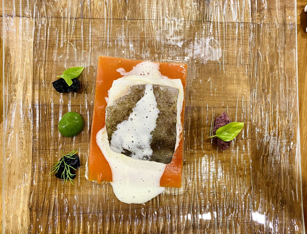 Tra i secondi piatti c’è la presenza della carne – come la Lingua di Vitello con nocciole e cipolla rossa – e del pesce, come il Baccalà in olio cottura con gelatina di pomodoro San Marzano, polvere di olive nere e basilico.