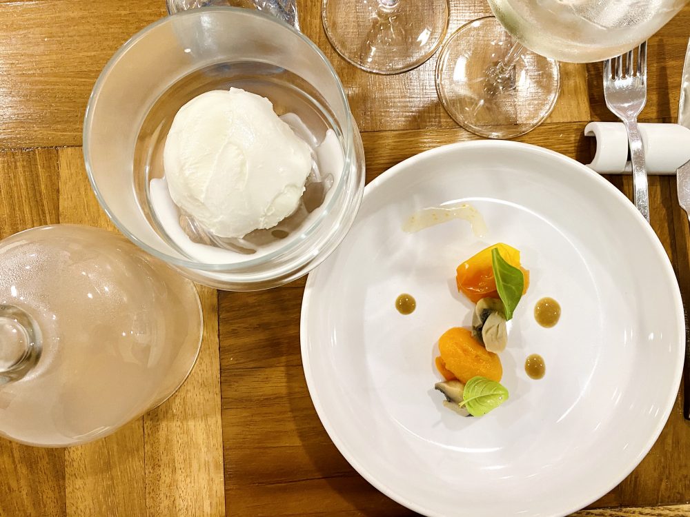 Tra i piatti riconfermati per l’apertura, La Bufala Campana dop dal cuore di tartare di gamberi imperiali, funghi e composta di pomodorini gialli del piennolo.