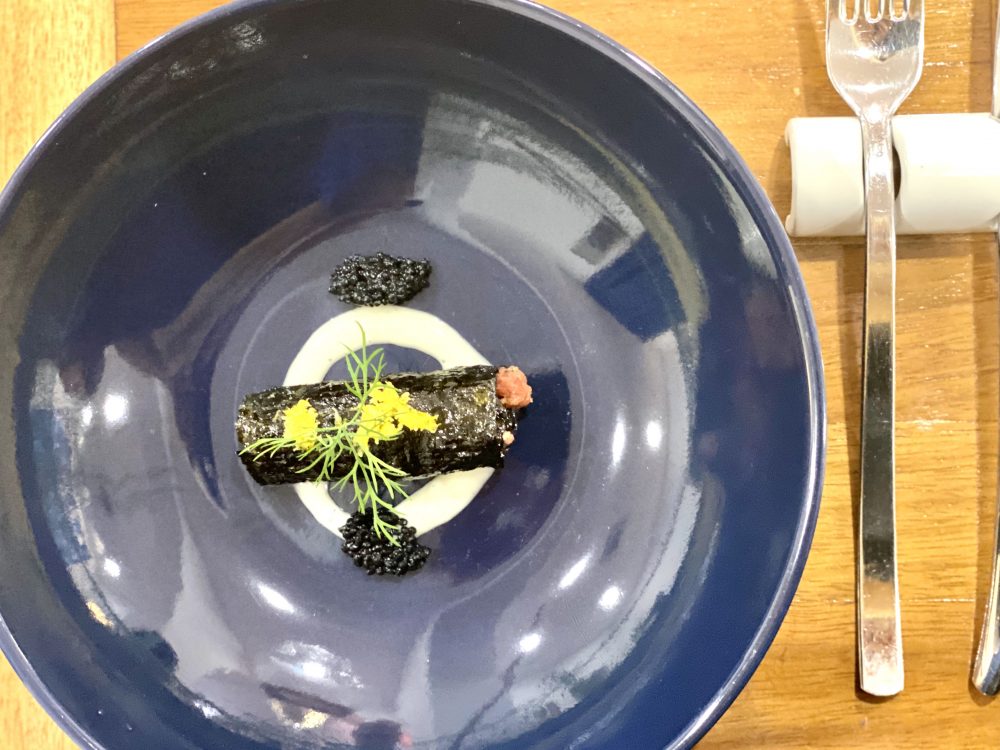 Oltre a tre percorsi di degustazione da 35, 50 e 70,00 euro, la scelta può ricadere su piatti alla carta che cambiano sovente, dando così l’opportunità di provare cose diverse. La cucina di Agape è composta da creazioni, rivisitazioni e interpretazioni di diverse ricette, legate alla lunga esperienza di Gabriele nelle cucine stellate, tra le quali quella di Antonello Colonna e di Pino Lavarra, giusto per fare qualche esempio. L’entreè di Cannolo di alga nori con tartare di chianina, lime, caviale ed emulsione di limoni di Sorrento, rende in parte l’idea degli accostamenti che ama proporre Gabriele.