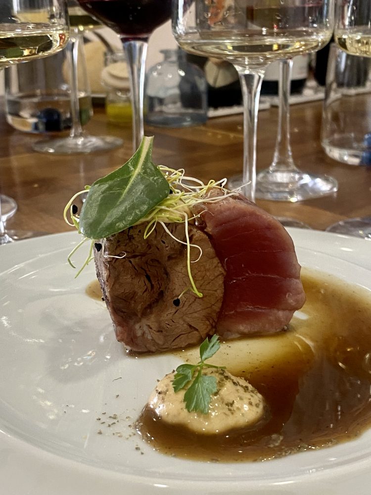 Poi la Mozzarella la bufala campana dop dal cuore di spalla d’agnello e spinaci, affumicata a freddo con trucioli di mandorlo e accompagnata con asparagi e polvere di limone. Per continuare con un grande classico della cucina italiana: il Vitello tonnato, riproposto in chiave molto personale, dove carne e pesce convivono nella stessa pietanza.