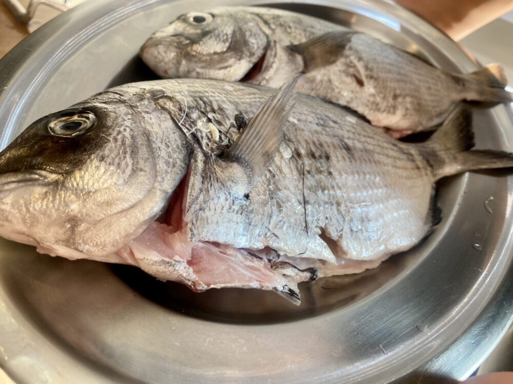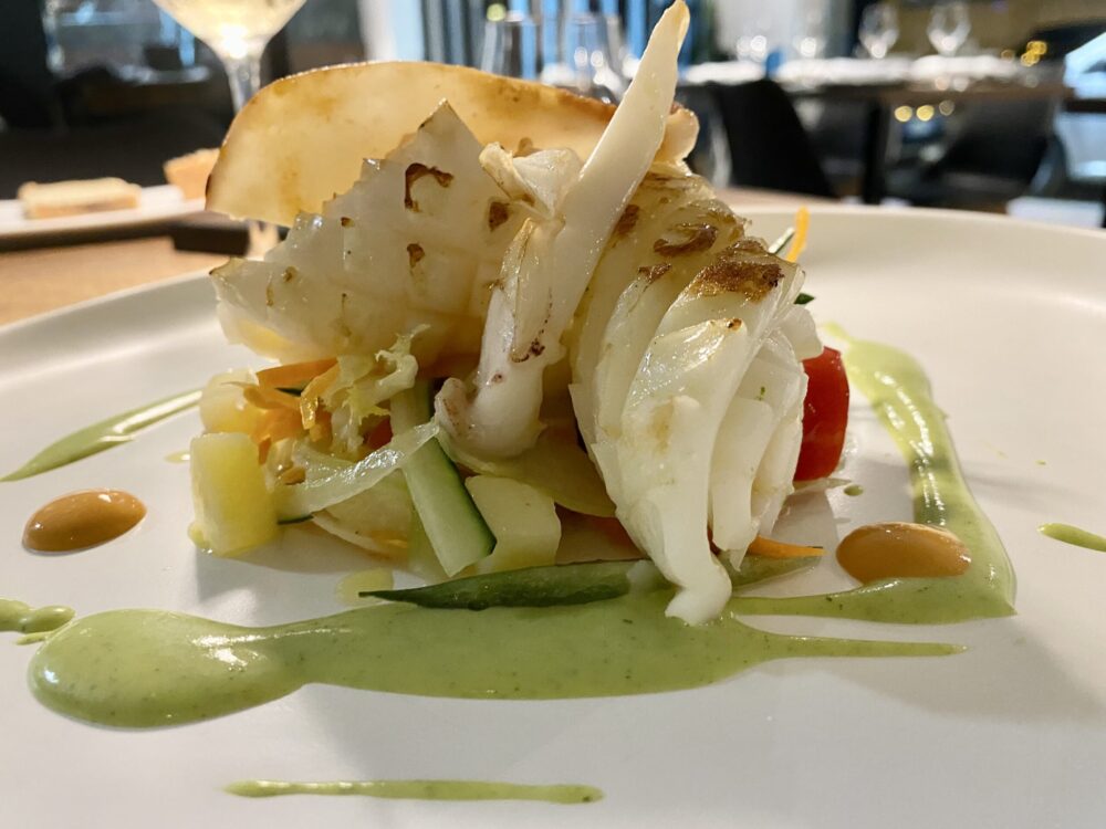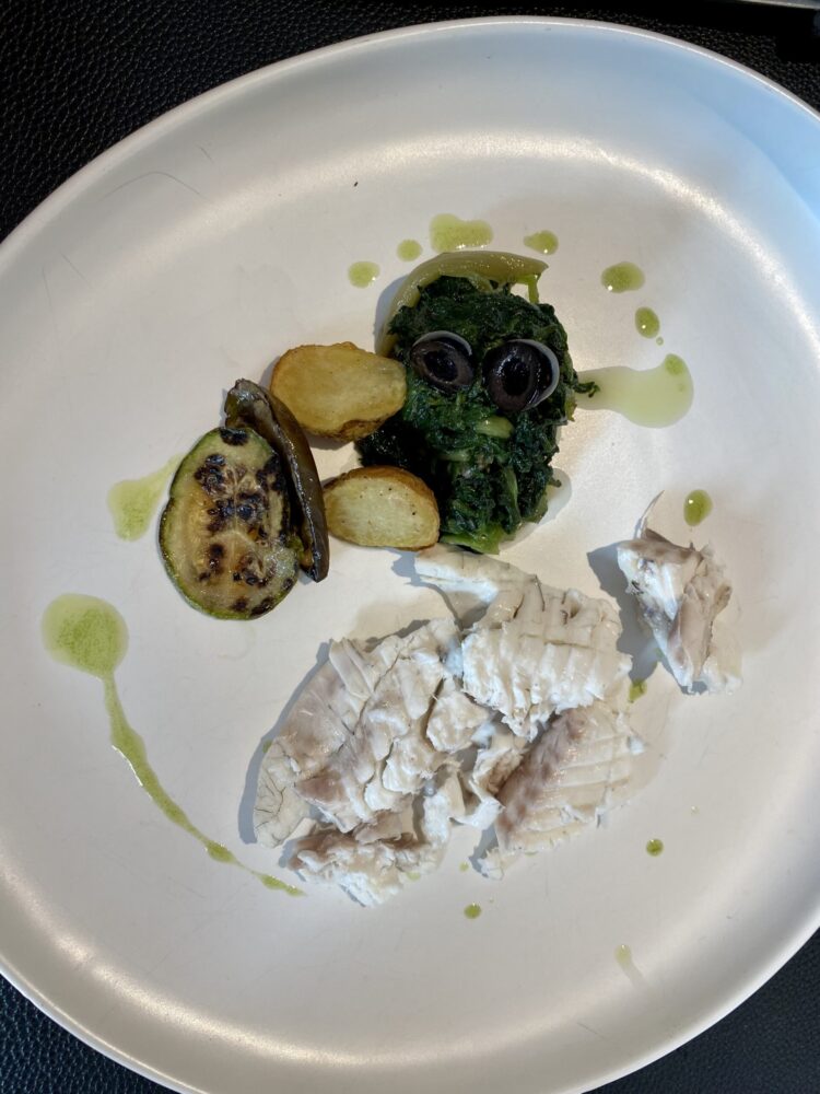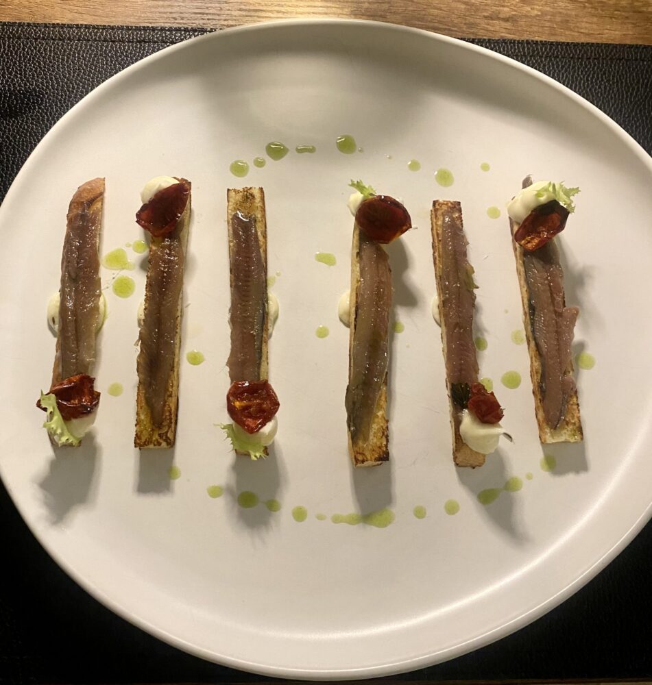 Dal menù: crudi e tartare di tonno, di salmone, di baccalà, poi mini bun con genovese di tonno, polpo arrosto con morbido di patate, limone, fagiolini e citronette; calamaro arrosto con insalata catalana; alici anche del Cantabrico servite con burro della Bretagna e pan brioche al parmigiano reggiano preparato in casa.