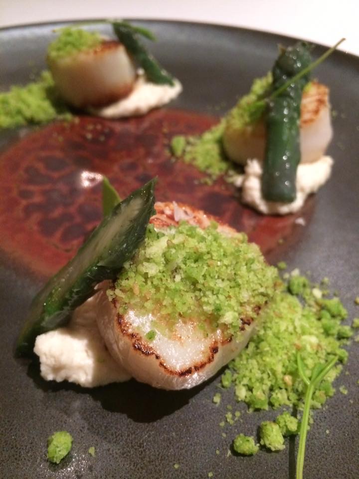 Terrazza Tiberio – capesante con salsa di mandorla, crumble di erbe e asparago violetto