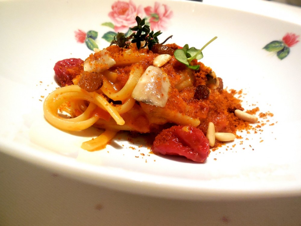 Mud, Linguine acciughe pomodoro confit pinoli uvetta – Il piatto piu’ godurioso della sera