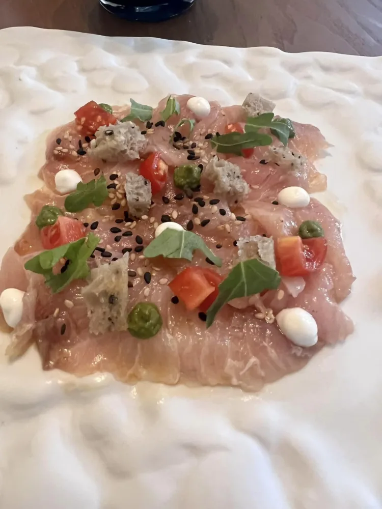 Ristorante Dolia a Gaeta: carpaccio di ricciola con taglio shashimi marinato in olio giapponese, pomodorino torpedino locale, rucola, pesto di basilico, sesamo bianco e spugna di pane.