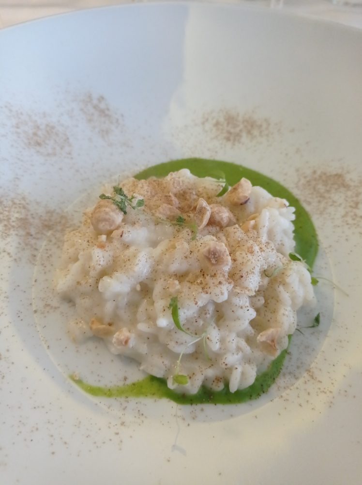 Ristoramnte Emozionando Riso carnaroli al cardoncello mantecato alla nocciola di Giffoni, cenere di porcini e acqua di prezzemolo