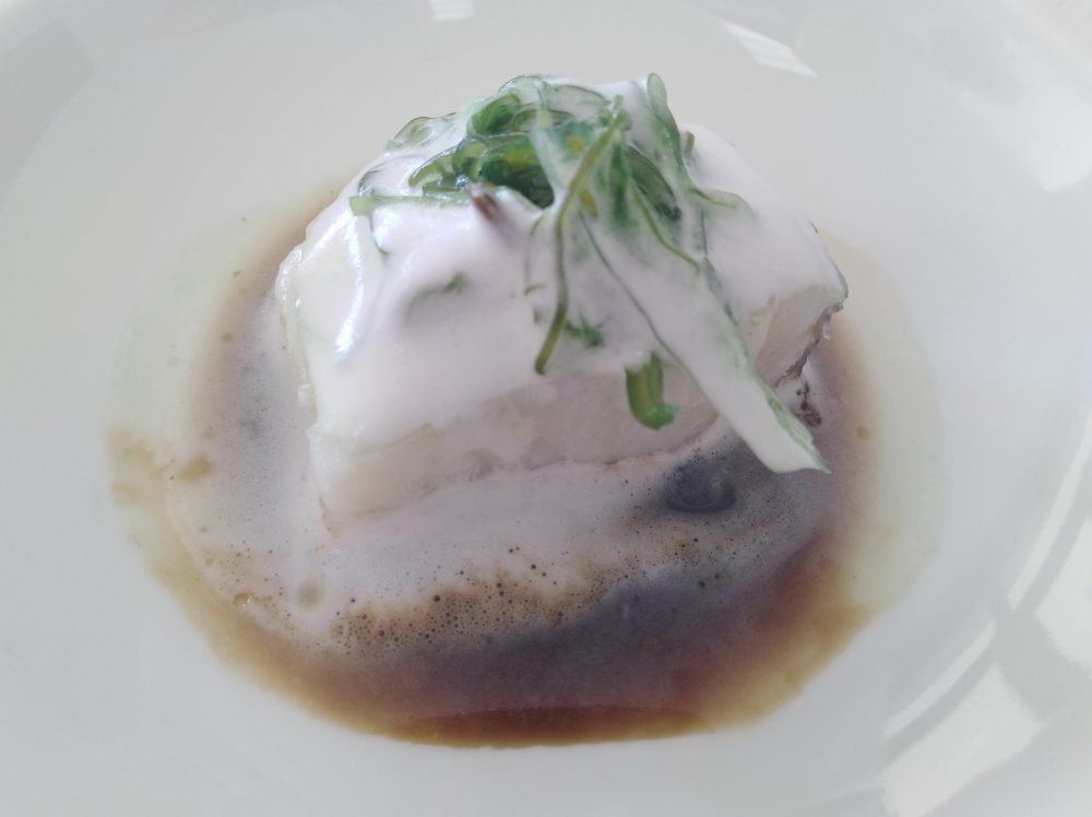 Viaggio in Calabria via Tokio. Baccalà al vapore con riduzione di liquirizia e alga wakame. Ecco qui un piatto che mi ha davvero impressionato in modo molto favorevole. Gli ingredienti si fondono perfettamente tra di loro, col dolciastro della liquirizia calabrese che contrasta la sapidità del morbido e scioglevole baccalà nordico. L’alga giapponese, poi, funge da impeccabile collante. Ottima l’acidità e la leggerezza di questo piatto.