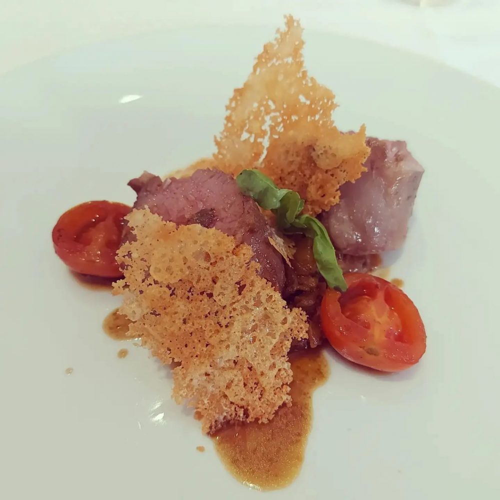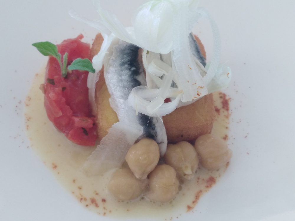 Strepitosa e saporita la crema brulé di ceci di Cicerale con prima marinatura di alici, pomodoro confit e croccante di sedano al lime. Piatto easy davvero sublime e bene eseguito e che fa l’occhiolino al territorio.